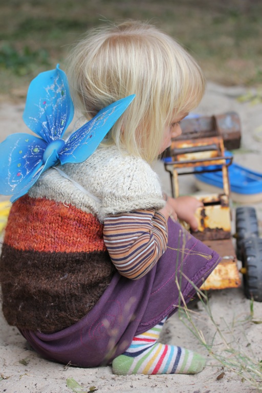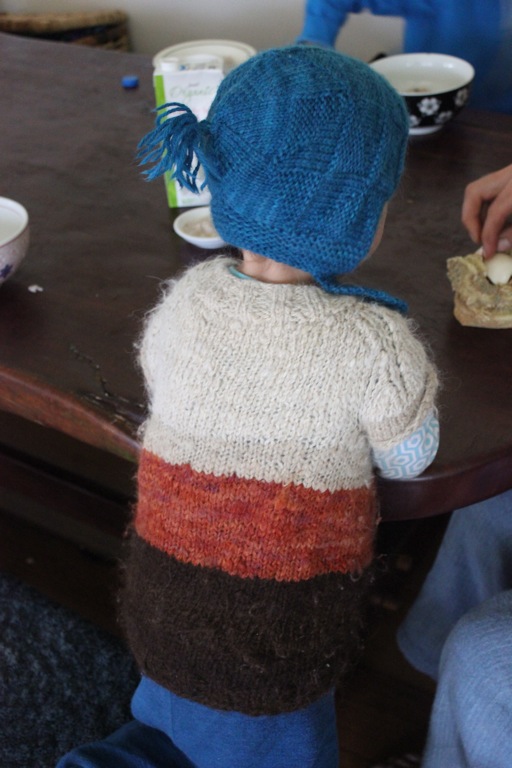 intended for the 3rd birthday but came in a day late as i had to make and unravel three times to get the sizing right. yep third time lucky. {next time just follow the pattern Rosi} i knit quite loosely and my things stretch quickly too big so i try to compensate. this knit taught me how to carry over colors when making patterns, fun!