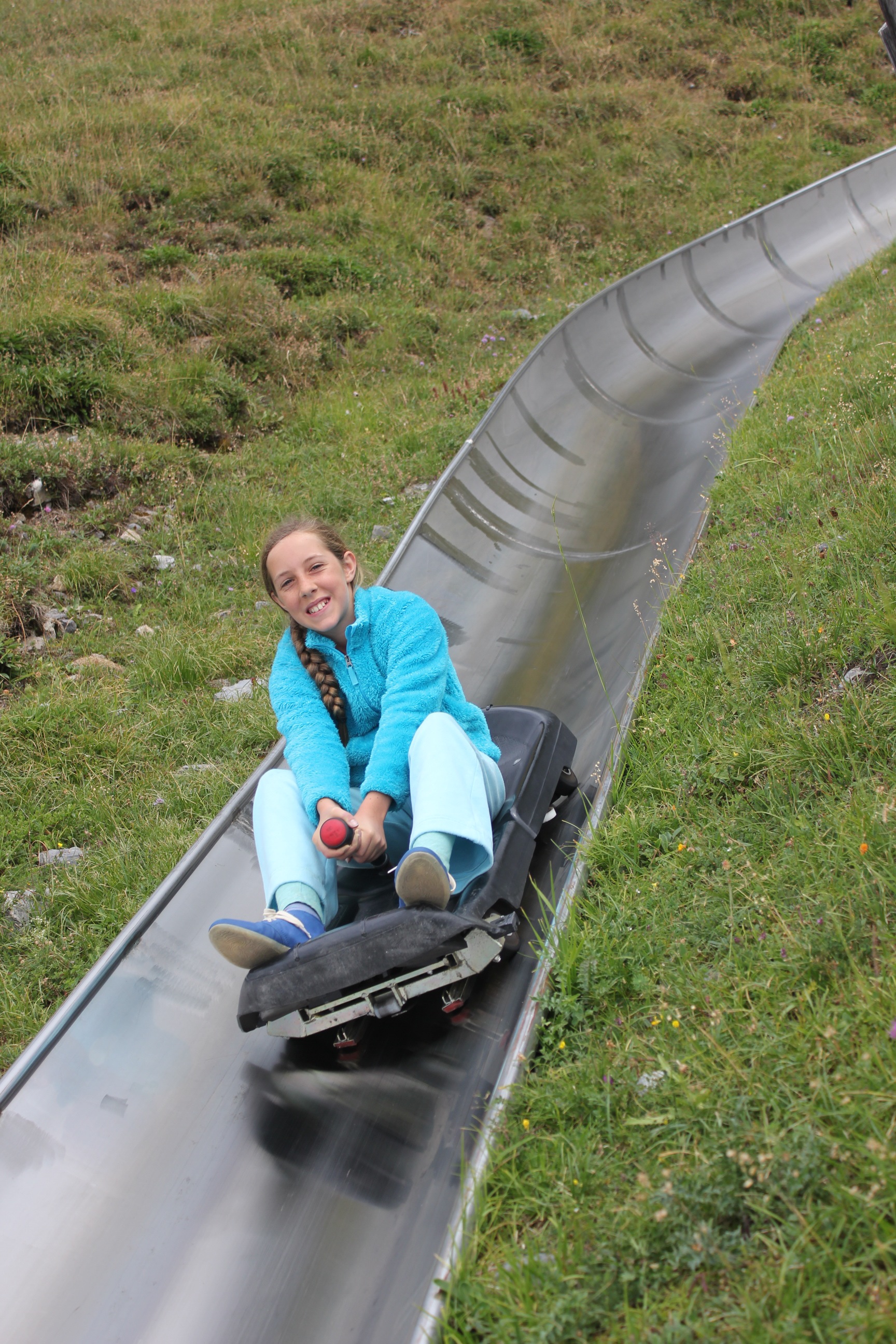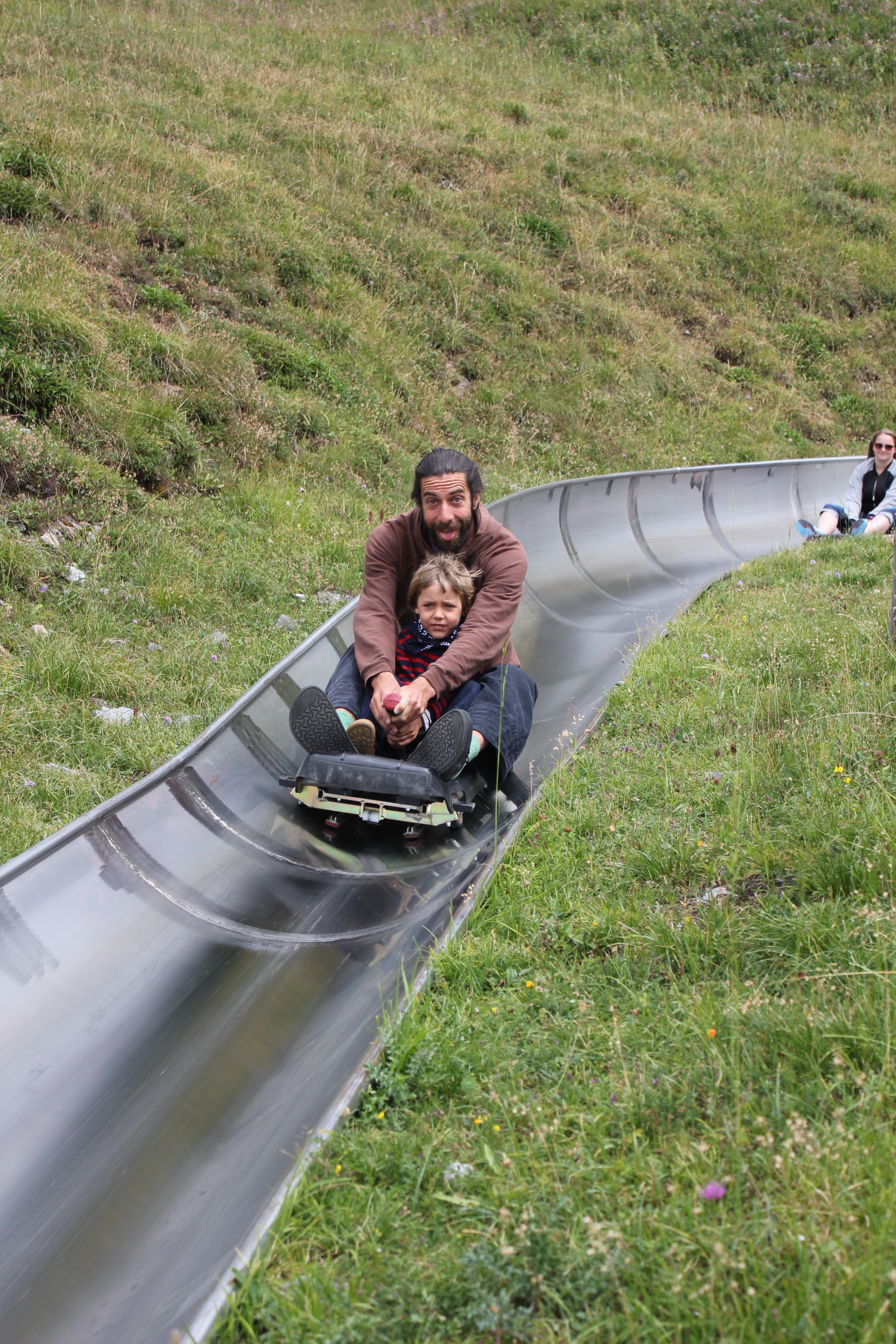 Up up up on the cable car from Falkenberg to Oeschin. Summer tobogganing.