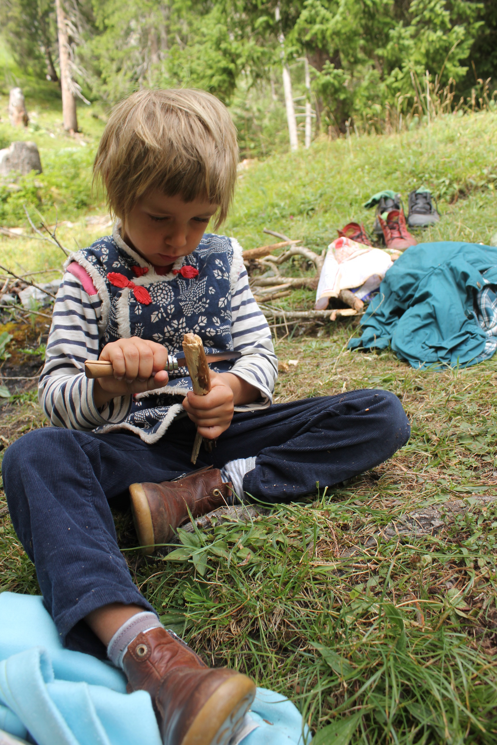 Another gift was a junior Opinel whittling knife . The end is round so not quite as perilous but just as sharp. There are sticks of softest pine to be found in the woods.