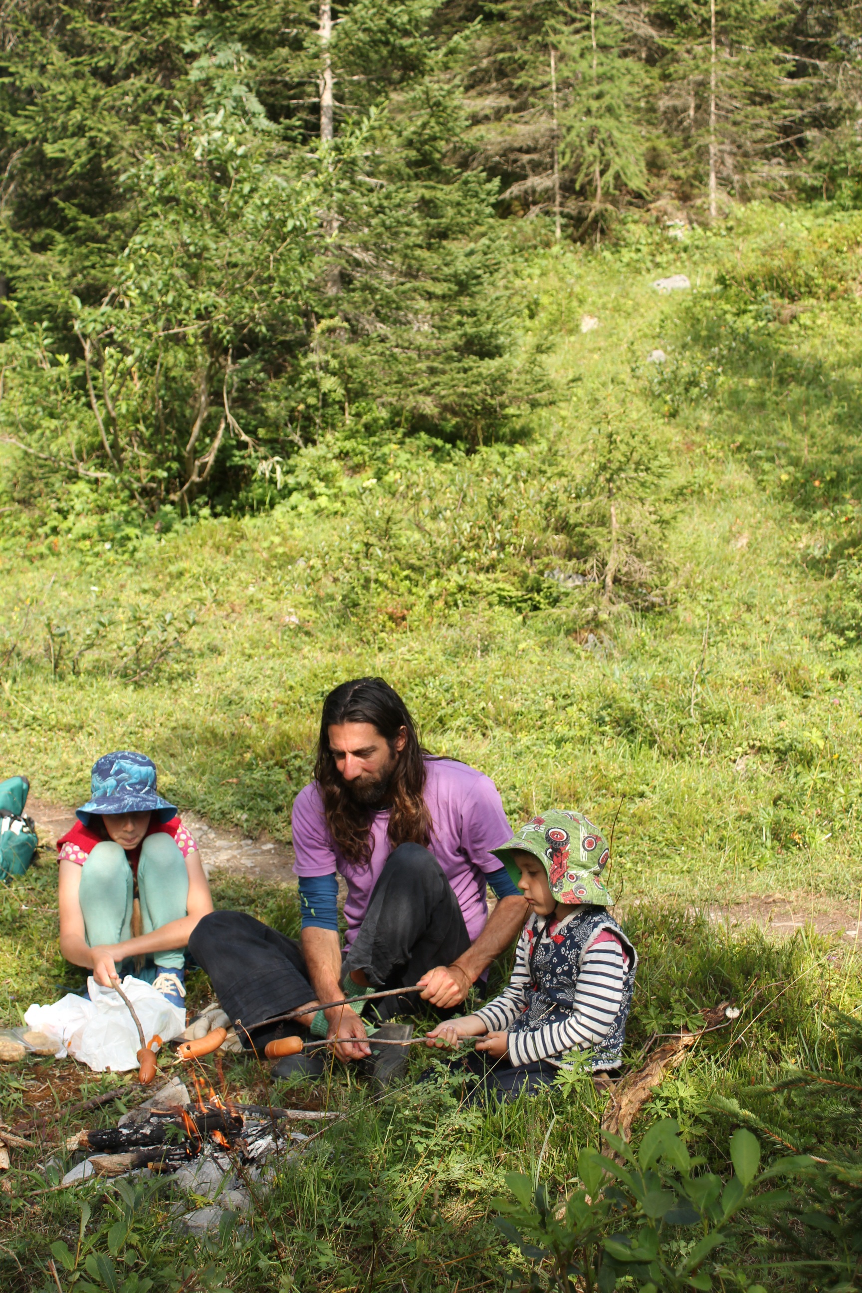 Jesse dared to leave the signed pathway (incredibly practical signs for Wanderweg/walkway with distances and times, everywhere in Switzerland. I love the walking culture. This has been a focus of our trip) and despite our resistance ( I’m imagining lost on the mountain in the dark with hungry tired little people) found us a gorgeous place to have a fire for our traditional Swiss sausage roasting.