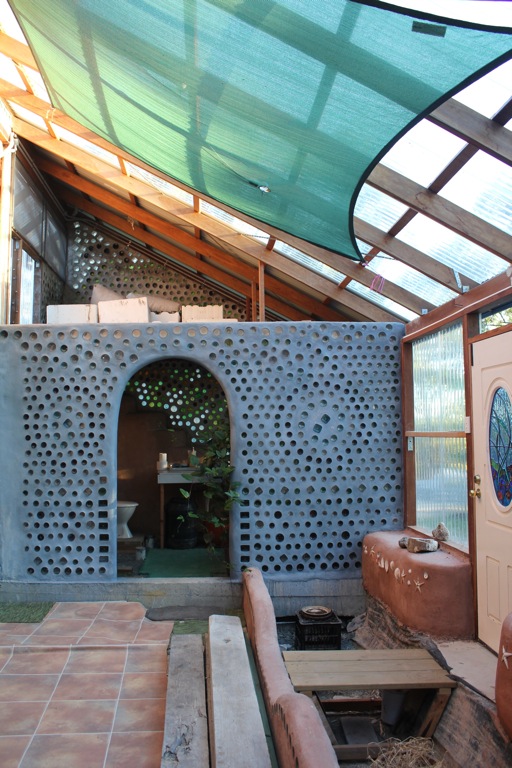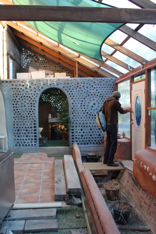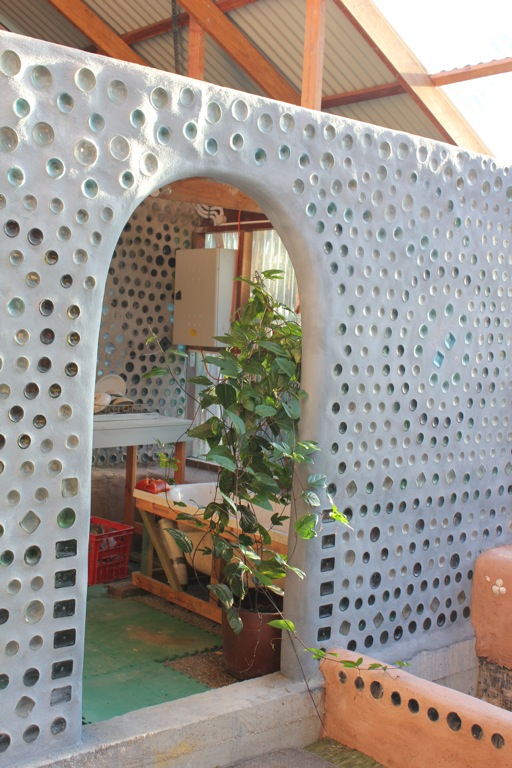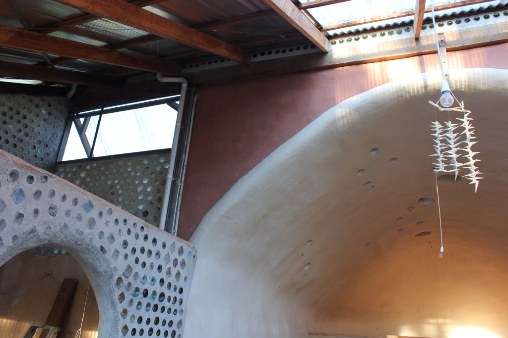 They have earth packed tyres as the wall structure and fill. The roof has skylights in each dome. Off the eastish and westish ends of the building are two smaller utility rooms framed with beautiful glass bottle walls. One already houses the bath and a vibrant vine, which tickles me as I thrive with plants inside, enlivening and oxygenating the living space.