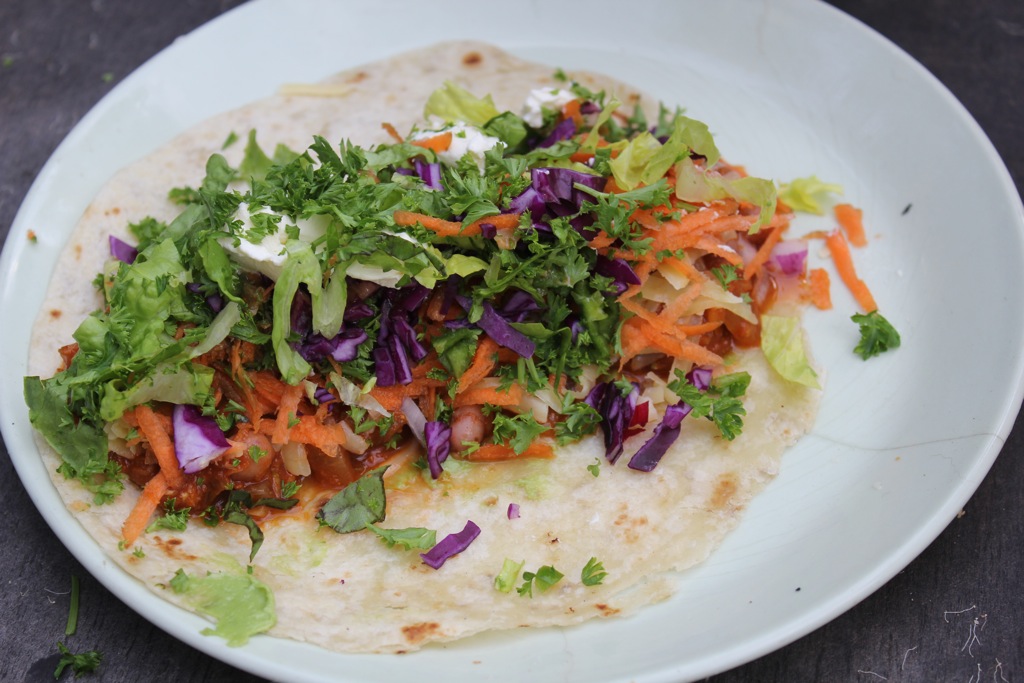 Little Peninsula, bean tortillas, the benches are all rotted out and wet so we all perch on the table, it’s really messy and the kids have their feet on the table and love it…