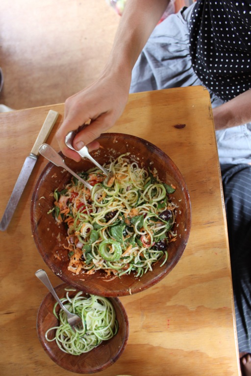 Warburton, raw zucchini pasta salad with all ingredients picked from the public gardens except olives and cheese