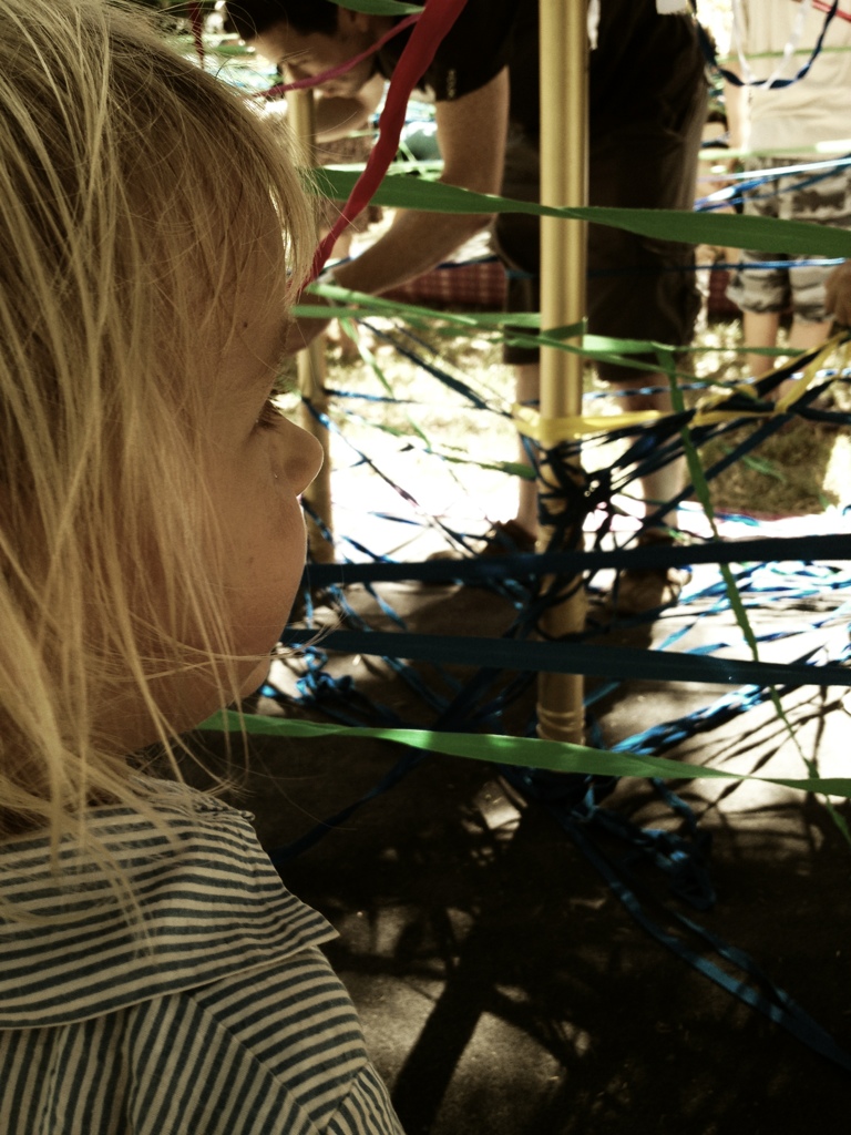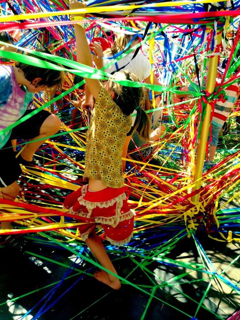 Lily gets wrapped up in Tangle! an excellent elastic jungle in the kids space. As each child entered the arena they are given a ball of elastic to tangle with while the band plays!