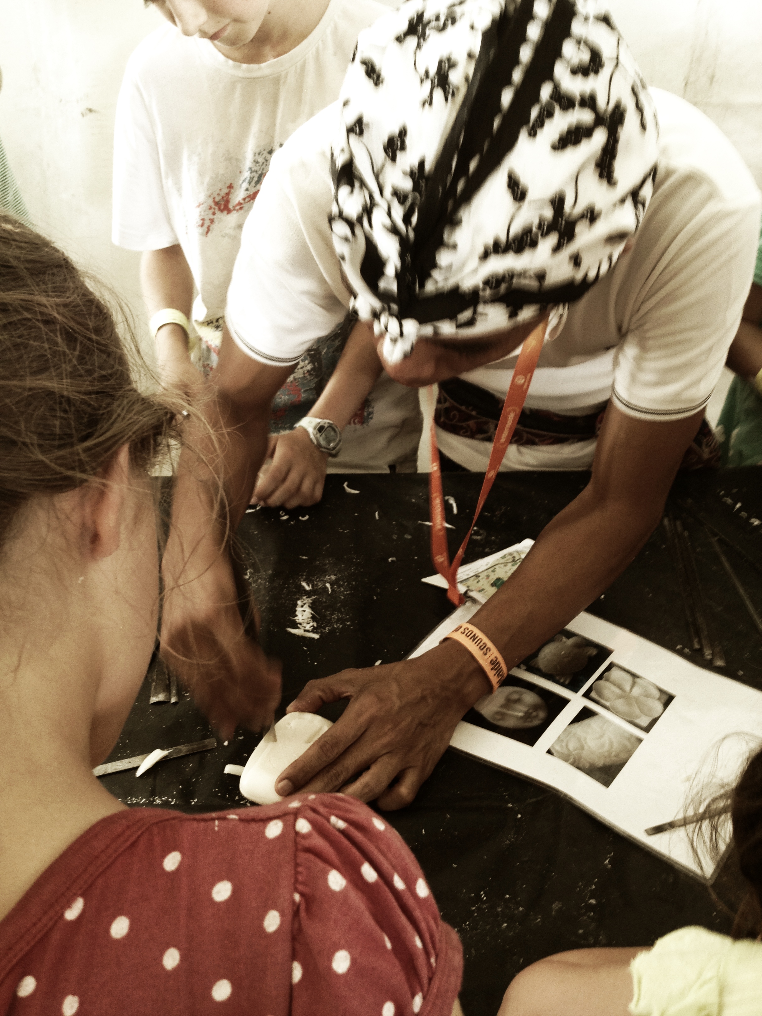 Lily participates in a Balinese soap carving workshop, the beginnings of a stone carvers training. she is the last child to leave the space and has impressed the balinese artist with her fine skills and deep persistance and concentration.